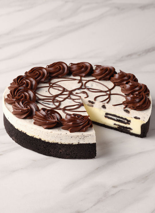 Indulge in our 10" Oreo Cookies & Cream cheesecake with 14 pre-sliced OREO® cookies baked in, layered with a decadent OREO® cookie mousse. Topped off with a rich chocolate ganache drizzle and milk chocolate rosettes. Satisfy your sweet tooth with this creamy and chocolatey delight!